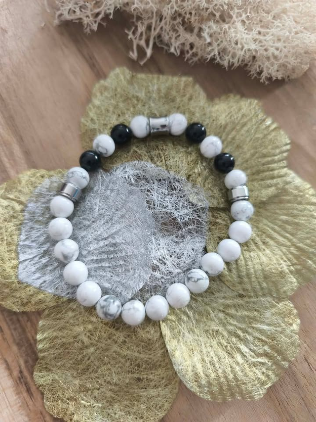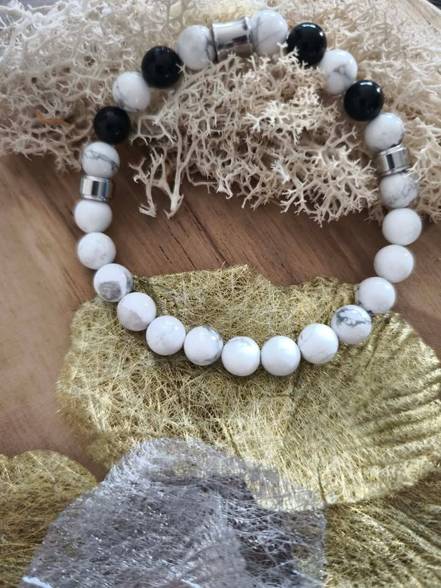 Un bracelet en perles d'howlite blanche et onyx ainsi que d'agrément en inox.