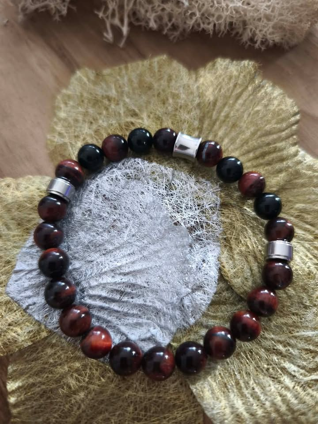 Un bracelet en perles d'œil de taureau et onyx ainsi que d'agrément en inox.